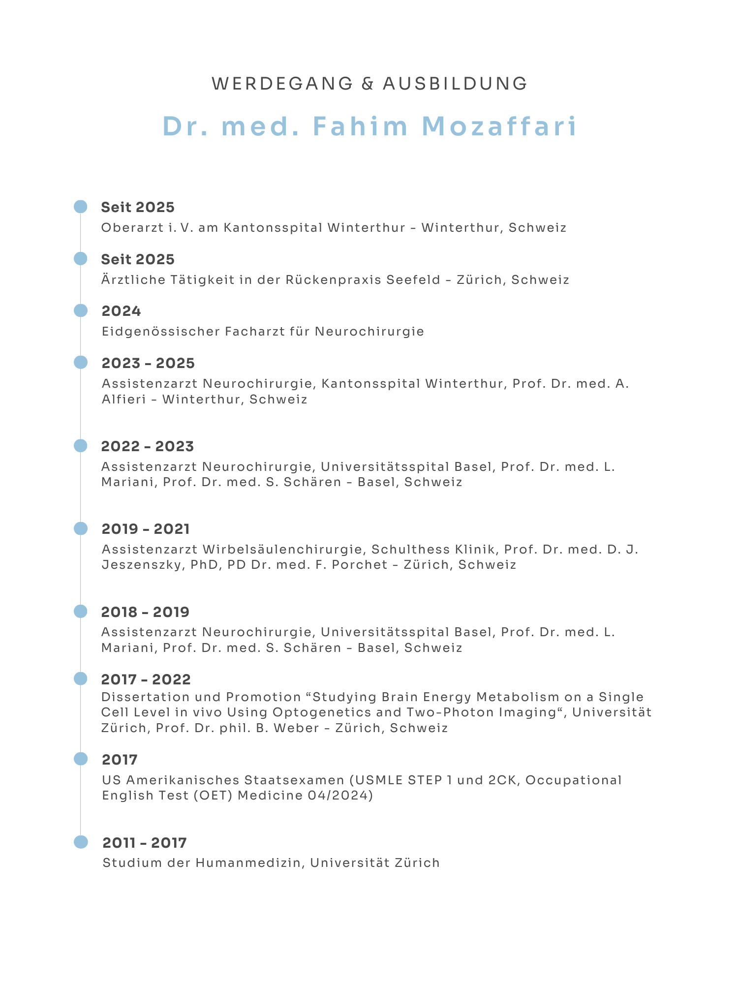 Dr. med. Fahim Mozaffari ist Facharzt für Neurochirurgie FMH und Mitglied der Schweizerischen Gesellschaft für Neurochirurgie (SGNC). In der Rückenpraxis Seefeld in Zürich behandelt er Patient:innen mit Erkrankungen der Wirbelsäule.
