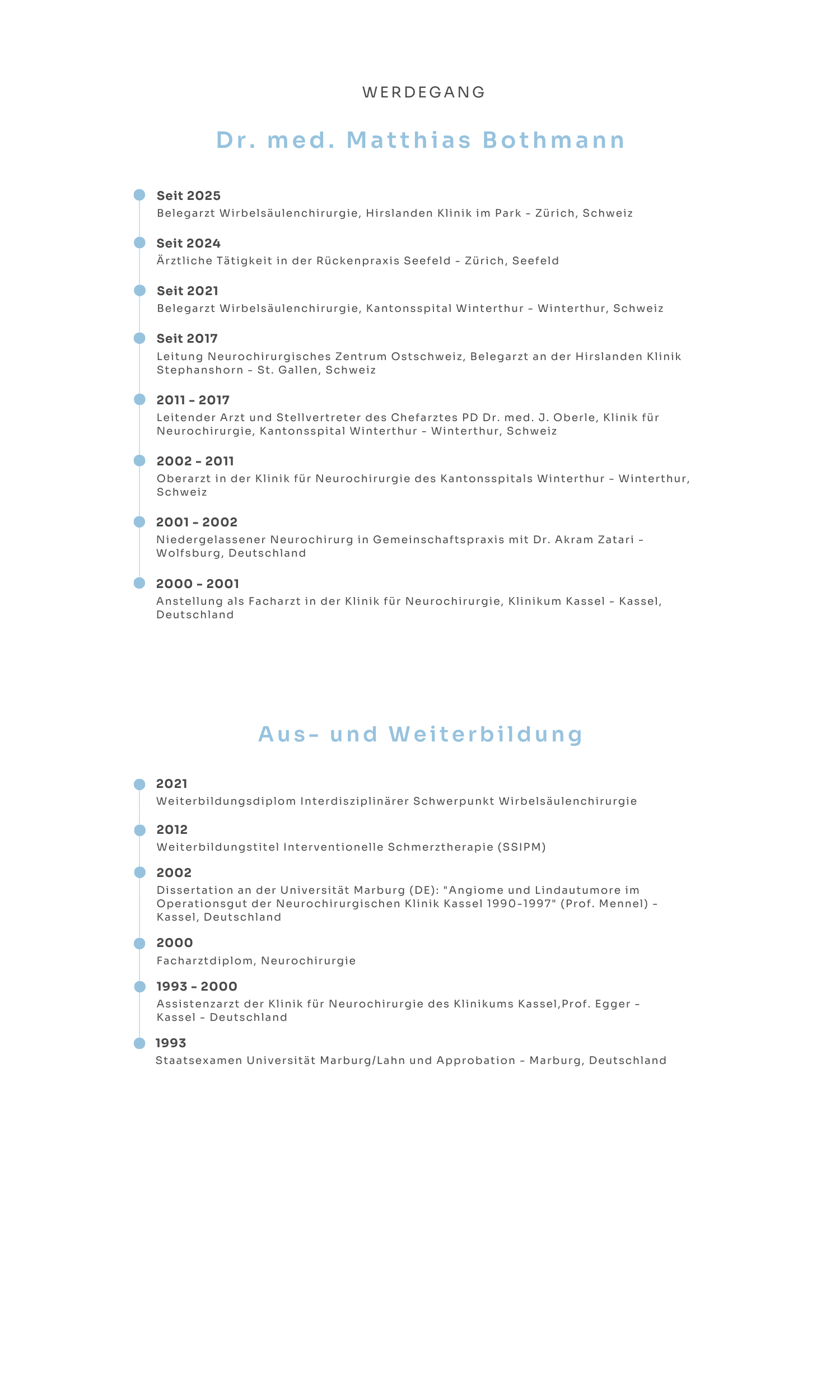 Dr. med. Matthias Bothmann ist Facharzt für Neurochirurgie FMH mit Schwerpunkt Wirbelsäulenchirurgie (SGNC/SO) und Weiterbildung in interventioneller Schmerztherapie (SSIPM). Er verfügt über umfassende Erfahrung in der konservativen und operativen Behandlung von Wirbelsäulenerkrankungen.